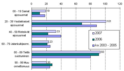 Liikennekuolemia sattui eniten onnettomuuksissa, joissa osapuolet ajoivat vastakkaisiin ajosuuntiin. Niissä kuoli 101 ihmistä eli 33 enemmän kuin edellisvuoden vastaavana aikana. Tieltäsuistumisonnettomuuksissa kuoli 93 ihmistä eli 2 enemmän kuin vuonna 2006.