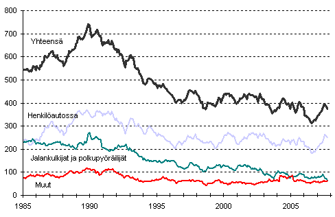 Tammi-syyskuussa tapahtui kaikkiaan 5 005 henkilövahinkoon johtanutta tieliikenneonnettomuutta. Onnettomuuksissa kuoli 289 ja loukkaantui 6 393 ihmistä. Kuolleita oli 48 enemmän ja loukkaantuneita 13 enemmän kuin vuoden 2006 vastaavana aikana. Surmansa saaneista oli liikkeellä henkilöautolla 193, moottoripyörällä 29, mopolla 7, pakettiautolla 5 ja kuorma-autolla 5. Jalankulkijoita kuoli 26 ja polkupyöräilijöitä 14. Lisäksi kuoli 10 muuta tienkäyttäjää.