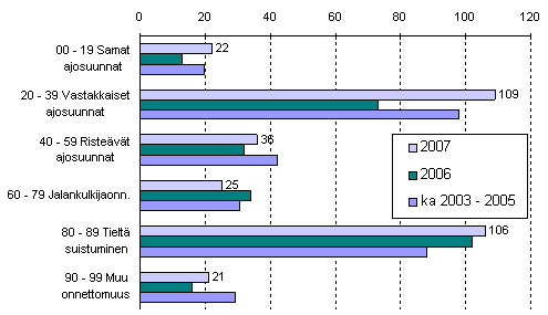 Liikennekuolemia sattui eniten onnettomuuksissa, joissa osapuolet ajoivat vastakkaisiin ajosuuntiin. Niissä kuoli 109 ihmistä eli 36 enemmän kuin edellisvuoden vastaavana aikana. Tieltäsuistumisonnettomuuksissa kuoli 106 ihmistä eli 4 enemmän kuin vuonna 2006.