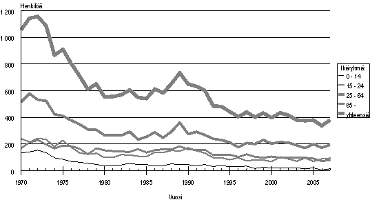 Tieliikenteessä kuolleet ikäryhmän mukaan (1970-2007)