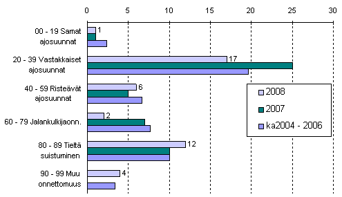 Liikennekuolemia sattui eniten onnettomuuksissa, joissa osapuolet ajoivat vastakkaisiin ajosuuntiin. Niissä kuoli 17 ihmistä eli 8 vähemmän kuin edellisvuoden vastaavana aikana. Tieltäsuistumisonnettomuuksissa kuoli 12 ihmistä eli 2 enemmän kuin vuonna 2007.