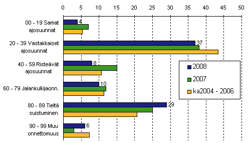 Liikennekuolemia sattui eniten onnettomuuksissa, joissa osapuolet ajoivat vastakkaisiin ajosuuntiin. Niissä kuoli 37 ihmistä eli 1 vähemmän kuin edellisvuoden vastaavana aikana. Tieltäsuistumisonnettomuuksissa kuoli 29 ihmistä eli 4 enemmän kuin vuonna 2007.