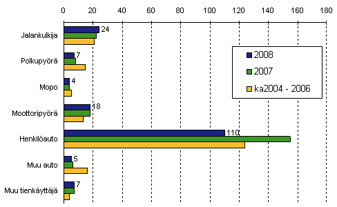 Liikennekuolemia sattui eniten tieltäsuistumisonnettomuuksissa, joissa kuoli 62 ihmistä eli 8 vähemmän kuin vuonna 2007. Onnettomuuksissa, joissa osapuolet ajoivat vastakkaisiin ajosuuntiin kuoli 50 ihmistä eli 35 vähemmän kuin edellisvuoden vastaavana aikana.