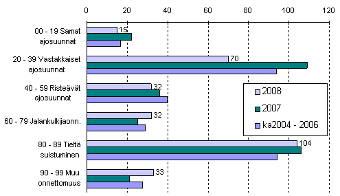 Liikennekuolemia sattui eniten tieltäsuistumisonnettomuuksissa, joissa kuoli 104 ihmistä eli 2 vähemmän kuin vuonna 2007. Onnettomuuksissa, joissa osapuolet ajoivat vastakkaisiin ajosuuntiin kuoli 70 ihmistä eli 39 vähemmän kuin edellisvuoden vastaavana aikana.