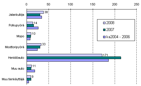 Tammi-lokakuun tieliikenteessä kuoli 171 henkilöautolla liikkunutta ihmistä, kun vastaava luku vuotta aikaisemmin oli 214. Jalankulkijoita menehtyi 38 ja moottoripyöräilijöitä 33.