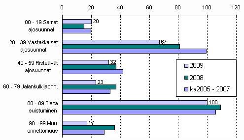 Liikennekuolemia sattui eniten tieltäsuistumisonnettomuuksissa, joissa kuoli 100 ihmistä eli 9 vähemmän kuin vuoden 2008 tammi-marraskuussa. Onnettomuuksissa, joissa ajoneuvot ajoivat vastakkaisiin ajosuuntiin, kuoli 67 ihmistä eli 14 vähemmän kuin edellisvuoden vastaavana aikana.