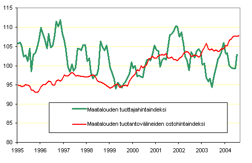 Maatalouden hintaindeksien 2000=100 kehitys 1995 - 2004