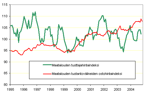 Maatalouden hintaindeksien 2000=100 kehitys 1995 - 2004
