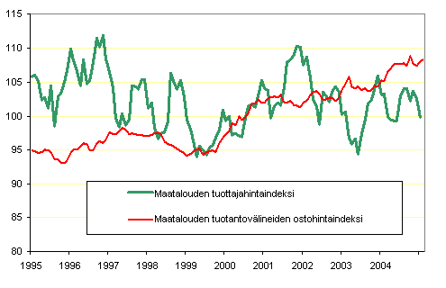 Maatalouden hintaindeksien 2000=100 kehitys 1995 - 2005