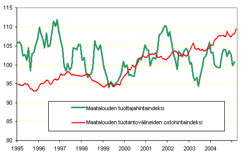 Maatalouden hintaindeksien 2000=100 kehitys 1995 - 2005