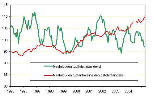 Maatalouden hintaindeksien 2000=100 kehitys 1995 - 2005