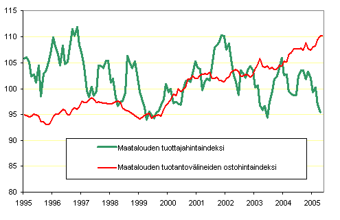 Maatalouden hintaindeksien 2000=100 kehitys 1995 - 2005