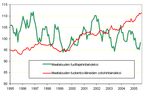 Maatalouden hintaindeksien 2000=100 kehitys 1995 - 2005