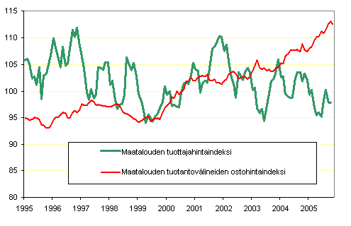 Maatalouden hintaindeksien 2000=100 kehitys 1995 - 2005