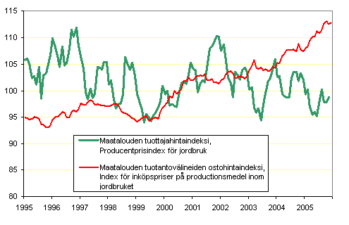 Maatalouden hintaindeksien 2000=100 kehitys 1995 - 2005