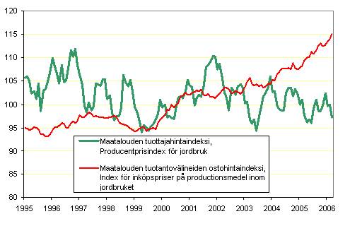 Maatalouden hintaindeksien 2000=100 kehitys 1995 - 2006