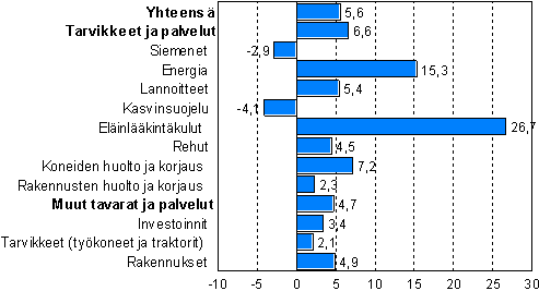 Maataloustuotantoon käytettyjen tarvikkeiden ja palveluiden 6,6 prosentin hintojen nousu johtuu pääasiassa energian kallistumisesta 15,3 prosentilla ja lannoitteiden 5,4 prosentilla. Polttoöljyn hinta on noussut vuodessa 22,7 prosenttia. Maatalouden investointeihin käytettävien tavaroiden ja palveluiden hintoja nostivat eniten koneiden ja muiden laitteiden kallistuminen 2,5 prosentilla ja rakennusinvestointien kallistuminen 4,9 prosentilla. Kasvinviljelyyn käytettävät koneet kallistuivat 2,3 prosenttia. Kasvinsuojelutuotteet olivat siementen ohella ainoat ryhmät, joiden hinnat laskivat. Kasvinsuojelutuotteiden hinnat laskivat 4,1 prosenttia ja siementen 2,9 prosenttia.