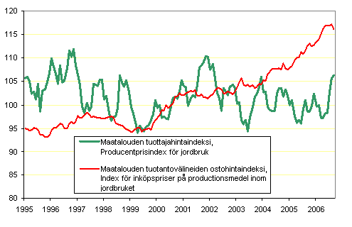 Maatalouden hintaindeksien 2000=100 kehitys 1995 - 2006