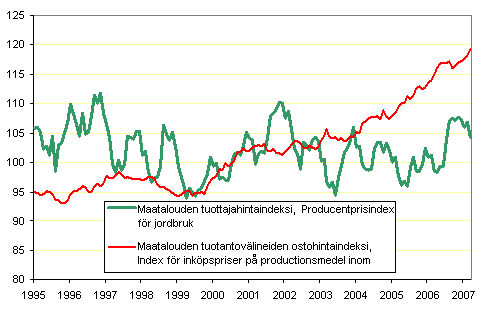 Maatalouden hintaindeksien 2000=100 kehitys 1995 - 2007
