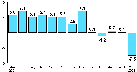 According to Statistics Finland, seasonally adjusted industrial output was 7.5 per cent lower in May 2005 than in May 2004. Seasonally adjusted output for the January to May period declined by 1.6 per cent from one year back.