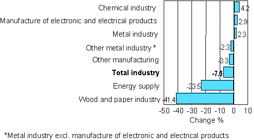 The industrial action in the paper industry was reflected in the figures on output in May. Among the main industries, output fell by most, or by as much as 41.4 per cent, in the wood and paper industry. The industrial action also affected the production and consumption of electricity. Energy supply declined by 23.5 per cent. Output went up by most, or 4.2 per cent, in the chemical industry. Manufacture of electrical and electronic products increased by 2.9 per cent. In the metal industry, output was up by 2.3 per cent year-on-year in May.