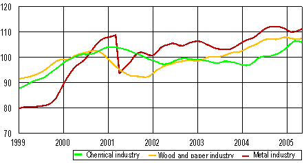In the metal industry, the downward trend came to a halt in April. In 2003, the metal industry accounted for 48 per cent of the total value added of Finnish industry. In the wood and paper industry, the trend turned to a slight decline in the early part of the year. The share of the wood and paper industry of the total value added was 16 per cent. The trend in the chemical industry was falling in May. The chemical industry generated 9 per cent of the total value added.