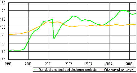 Measured in terms of value added, the manufacture of electrical and electronic products has become Finland's most important industry. Its share of the total value added was 24 per cent in 2003. The trend in the manufacture of electrical and electronic products took a slight swing upwards in May. In the other metal industry, which accounted for 24 per of the total value added, output has followed an evenly modest path.