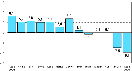 Teollisuuden kausitasoitettu tuotanto oli Tilastokeskuksen mukaan vuoden 2005 kesäkuussa 9,8 prosenttia pienempi kuin vuoden 2004 kesäkuussa. Teollisuustuotanto laski edellisen kerran yhtä voimakkaasti syvimpään lama-aikaan 90-luvun alussa.