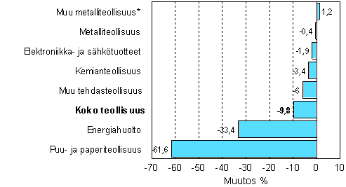 Paperiteollisuuden työtaistelu näkyi koko painolla kesäkuun tuotantoluvuissa. Päätoimialoista laski eniten puu- ja paperiteollisuus, peräti 61,6 prosenttia. Työtaistelu vaikutti myös sähkön tuotantoon ja kulutukseen. Energiahuolto laski 33,4 prosenttia. Päätoimialoista kasvoi ainoastaan muu metalliteollisuus, runsaan prosentin.