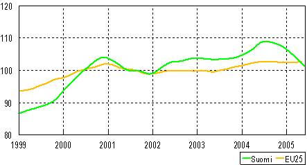 Teollisuustuotannon trendi 1999-2005, (Suomi ja EU 25), 2000=100