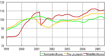 Metalliteollisuuden trendin lasku pysähtyi huhtikuussa. Metalliteollisuuden osuus Suomen teollisuuden jalostusarvosta oli 48 % vuonna 2003. Puu- ja paperiteollisuuden trendi kääntyi lievään laskuun alkuvuonna. Puu- ja paperiteollisuuden osuus jalostusarvosta oli 16 %. Kemianteollisuuden trendi laski edelleen kesäkuussa. Kemianteollisuuden osuus jalostusarvosta oli 9 %.