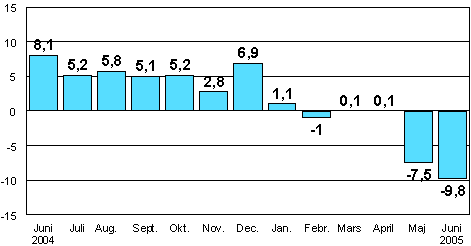 Enligt Statistikcentralen var den säsongrensade industriproduktionen 9,8 procent mindre i juni 2005 än i juni 2004. Industriproduktionen sjönk föregående gång lika kraftigt under den djupaste lågkonjunkturen i början av 90-talet.