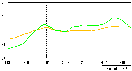 Trenden för industriproduktionen 1999-2005, (Finland och EU 25), 2000=100