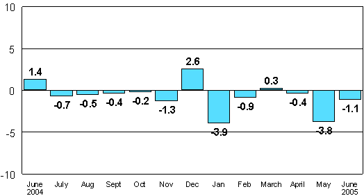 According to Statistics Finland, seasonally adjusted industrial output was 1.1 per cent lower in June 2005 than in May. Seasonally adjusted volume of industrial output fell by 9.8 per cent year-on-year from June 2004. Output for the January to June period declined by 3 per cent from one year ago.