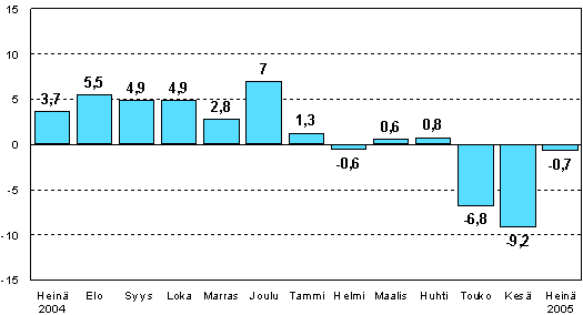 Teollisuuden kausitasoitettu tuotanto oli Tilastokeskuksen mukaan vuoden 2005 heinäkuussa 0,7 prosenttia pienempi kuin vuoden 2004 heinäkuussa.