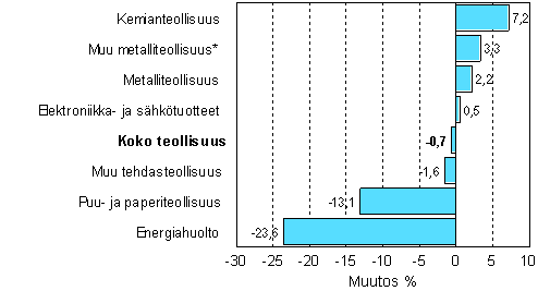 Paperiteollisuuden kesäkuussa päättynyt työtaistelu heijastui vielä heinäkuun tuotantoluvuissa. Päätoimialoista laski eniten energiahuolto 23,6 prosenttia. Puu- ja paperiteollisuuden tuotanto laski heinäkuussa 13,1 prosenttia. Eniten tuotanto kasvoi kemianteollisuudessa 7,2 prosenttia. Metalliteollisuuden tuotanto kasvoi 2,2 prosenttia.