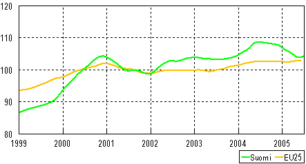 Teollisuustuotannon trendi 1999-2005, (Suomi ja EU 25), 2000=100