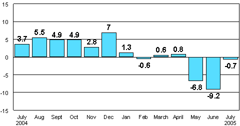According to Statistics Finland, seasonally adjusted industrial output was 0.7 per cent lower in July 2005 than in July 2004.
