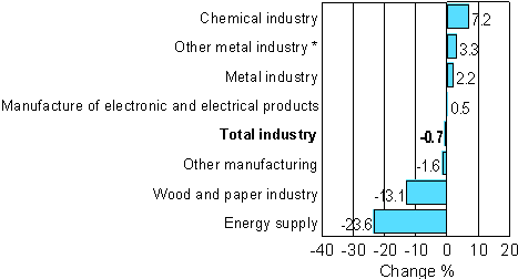 The industrial action in the paper industry, which ended in June, was still reflected in the July output figures. Among the main industries, output fell by most, or by 23.6 per cent, in energy supply. Output in the wood and paper industry went down by 13.1 per cent in July. Output grew by most in the chemical industry, by 7.2 per cent. In the metal industry output rose by 2.2 per cent.