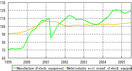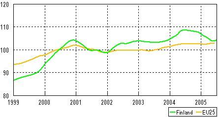 Trend in industrial output 1999-2005, (Finland and EU 25), 2000=100