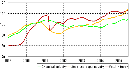 In the metal industry, the trend turned to growth in the summer. In 2003, the metal industry accounted for 48 per cent of the total value added of Finnish industry. In the wood and paper industry, the trend also turned upwards. This was due to the ending of the industrial action in the paper industry in June. The share of the wood and paper industry of the total value added was 16 per cent. The trend in the chemical industry took a slight swing upwards. The chemical industry generated 9 per cent of the total value added.