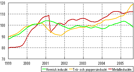 I september 2005 var den säsongrensade industriproduktionen enligt Statistikcentralen 1,6 procent mindre än i september 2004.