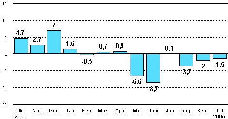 I oktober 2005 var den säsongrensade industriproduktionen enligt Statistikcentralen 1,5 procent mindre än i oktober 2004.