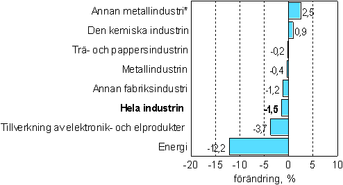 I oktober sjönk energiförsörjningen mest, dvs. med drygt 12 procent jämfört med året innan. Bakom nedgången låg den kraftigt ökade energiimporten. Tillverkningen av elektronik- och elprodukter sjönk i oktober med något under 4 procent. Produktionen inom den kemiska industrin ökade med något under en procent. Produktionen inom den övriga metallindustrin fortsatte att öka i oktober. Ökningen berodde i stor utsträckning på den kraftiga ökningen av fordonsindustrin. Också tillverkningen av maskiner och utrustning ökade i oktober.