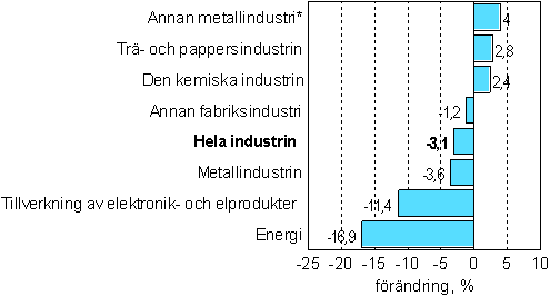 I november sjönk energiförsörjningen mest, dvs. med något under 17 procent jämfört med året innan. Bakom nedgången låg den kraftigt ökade energiimporten. Tillverkningen av elektronik- och elprodukter sjönk i november med över 11 procent. Produktionen inom trä- och pappersindustrin ökade med något under 3 procent och den kemiska industrin över 2 procent. Produktionen inom den övriga metallindustrin fortsatte att öka i november. Ökningen berodde i stor utsträckning på den kraftiga ökningen av fordonsindustrin.