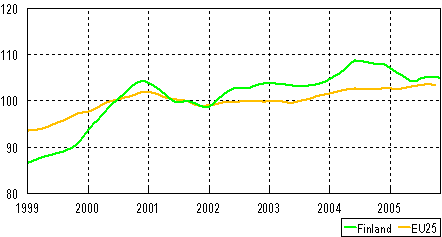 Trenden för industriproduktionen 1999-2005, (Finland och EU 25), 2000=100