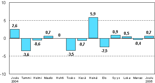 Teollisuuden kausitasoitettu tuotanto oli Tilastokeskuksen mukaan vuoden 2005 joulukuussa 0,7 prosenttia suurempi kuin marraskuussa. Teollisuustuotannon kausitasoitettu tuotantomäärä laski 2,8 prosenttia vuoden 2004 joulukuuhun verrattuna. Teollisuustuotanto laski viime vuonna 2,5 prosenttia.