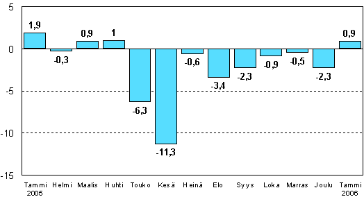 Teollisuuden kausitasoitettu tuotanto oli Tilastokeskuksen mukaan vuoden 2006 tammikuussa 0,9 prosenttia suurempi kuin vuoden 2005 tammikuussa. Teollisuustuotannon lähes koko viime vuoden kestänyt alamäki näyttää päättyneen.