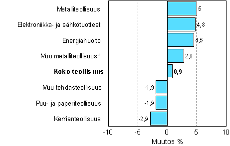 Tammikuussa kasvoi eniten metalliteollisuuden tuotanto, 5 prosenttia, vuoden 2005 tammikuuhun verrattuna. Kasvua vauhditti sähkö- ja elektroniikkatuotteiden valmistus, joka kasvoi lähes 5 prosenttia. Muun metalliteollisuuden tuotanto kasvoi lähes 3 prosenttia. Myös energiahuolto kasvoi ensimmäisen kerran runsaaseen vuoteen.