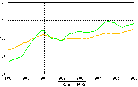 Teollisuustuotannon trendi 1999-2006, (Suomi ja EU 25), 2000=100